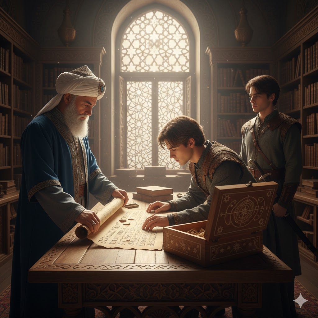 Ένα πρωινό όμως, ο Δημήτριος ένιωσε τον ιστό αυτό να τρέμει. Ο Μουχάμαντ τον κάλεσε στο ιδιαίτερο δωμάτιό του, εκεί όπου φυλασσόταν ό, τι δεν προοριζόταν για πολλά μάτια. Πάνω στο τραπέζι βρισκόταν ένα κουτί από κέδρο, σκαλισμένο με λεπτά αστέρια και καμπύλες που θύμιζαν τις τροχιές των πλανητών. Μια ανεπαίσθητη μυρωδιά ρητίνης σκορπούσε τριγύρω. Ο Μουχάμαντ άνοιξε το κουτί σαν να ξεκλείδωνε μυστικό. Από μέσα έβγαλε έναν φθαρμένο πάπυρο. Τον ξετύλιξε επάνω στο τραπέζι με την προσοχή ανθρώπου που κρατάει στα χέρια του κάτι ζωντανό.