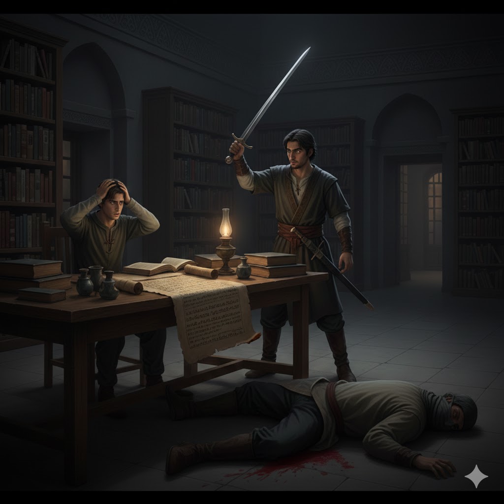 Ένα βράδυ, ενώ ο Δημήτριος μετέφραζε μια δύσκολη παράγραφο, η πόρτα της αίθουσας άνοιξε με κρότο. Δύο άνδρες μπήκαν μέσα, με τα πρόσωπα καλυμμένα. Ο ένας κρατούσε ένα μαχαίρι που γυάλιζε στο φως της λάμπας.